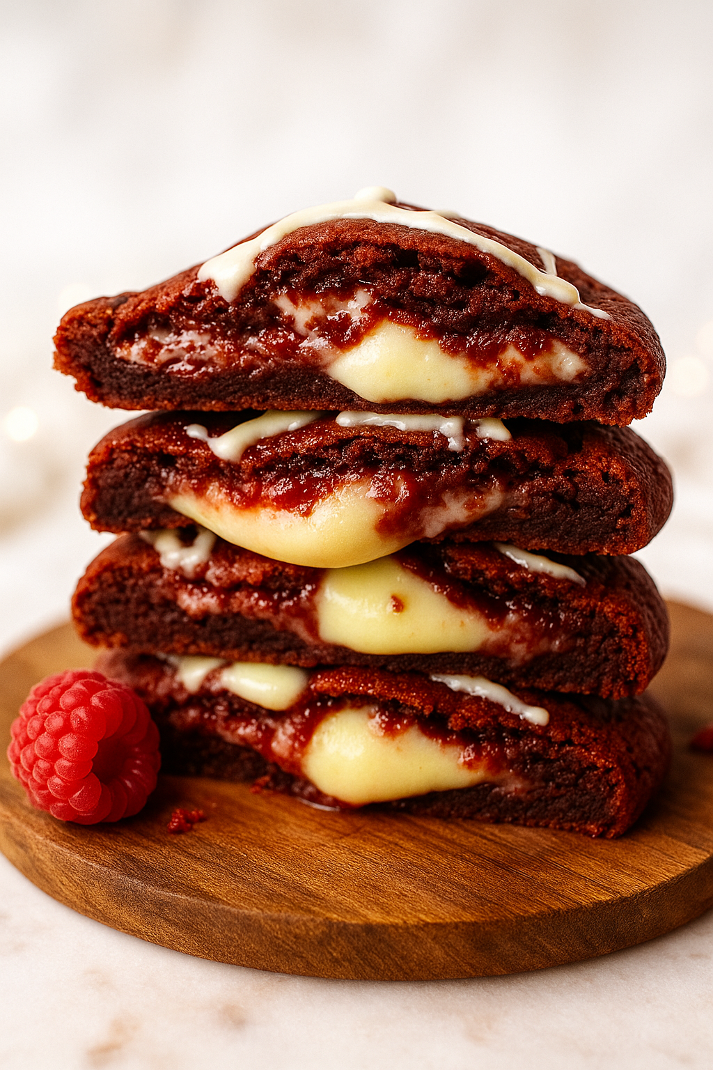 En klassisk New York-stil Red Velvet-cookie – tjock, seg och rik på smak. Den har krispiga kanter, ett saftigt inre, vit chokladchips i varje tugga och ett oemotståndligt hjärta av len cream cheese.