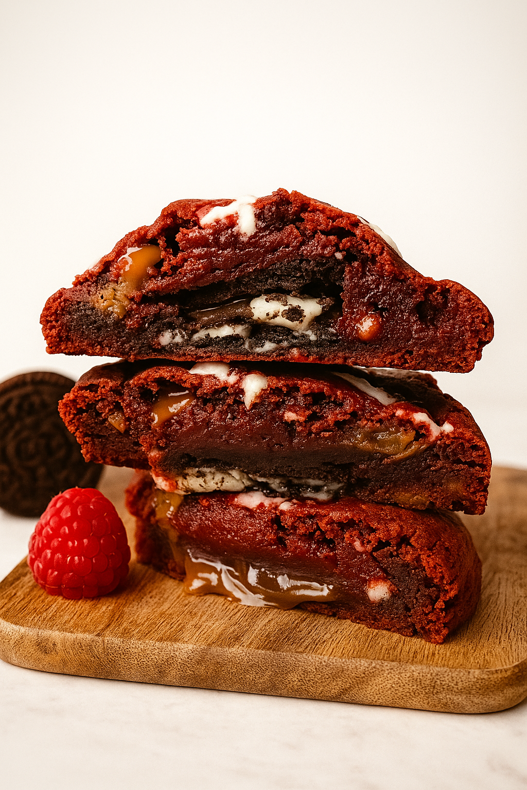 En klassisk New York-stil Red Velvet-cookie, fylld med choklad och krossade Oreo-kakor. Med krispiga kanter, mjuk och seg mitt och ett oemotståndligt hjärta av len cream cheese, blir varje tugga en fest för både smaklökar och öga.